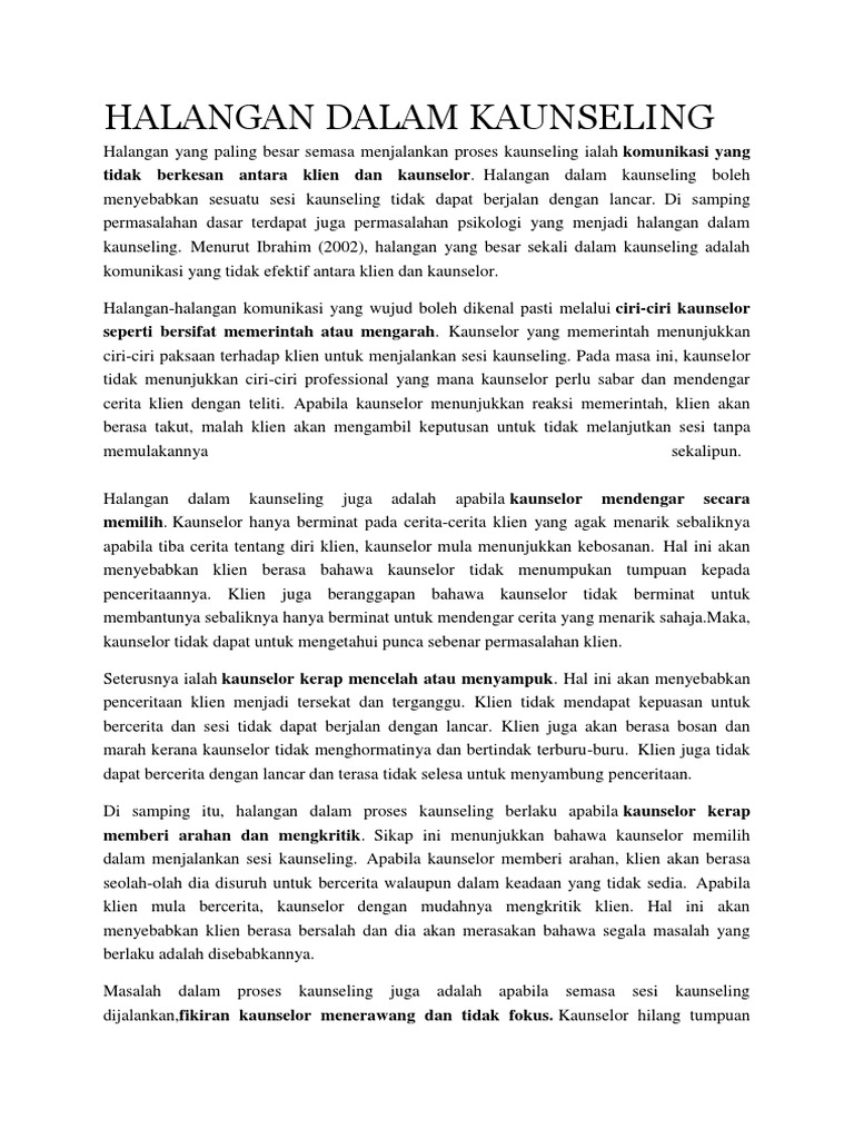 Pelbagai bidang profesion kaunseling di sekolah rendah telah dilupakan serta dengan kekurangan pemahaman serta penghayatan contohnya sikap nilai kepercayaan. REFLEKSI PENGALAMAN Refleksi pengalaman dibuat setelah kaunselor memerhatikan gerak-geri tubuh semasa sesuatu pengalaman diperkatakan oleh klien. Efikasi Kendiri Kaunseling dan Kecekapan Kaunseling Pelbagai Budaya dalam Kalangan Guru Bimbingan dan Kaunseling Sekolah Menengah di Malaysia.